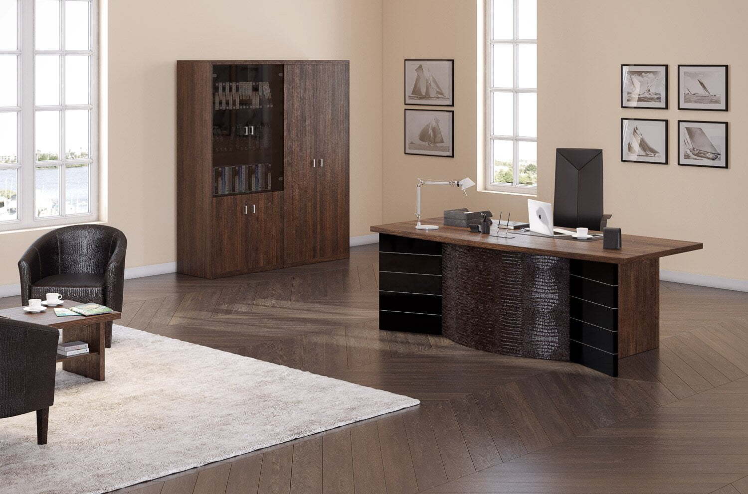 Мебельная коллекция кабинета руководителя Sirius предлагает оригинальный дизайн, надежность и комфорт. С разнообразной комплектацией, она позволяет эргономично организовать рабочее место. Изготовленная из высококачественных материалов, эта мебель имеет переднюю панель из искусственной кожи и алюминиевые молдинги, что придает ей современный вид. Коллекция предназначена для ценителей современного стиля и нестандартных решений, сочетая в себе функциональность и эстетическое исполнение. В коллекции Sirius продуманы все детали, создавая идеальные условия для продуктивной работы и комфорта руководителя.