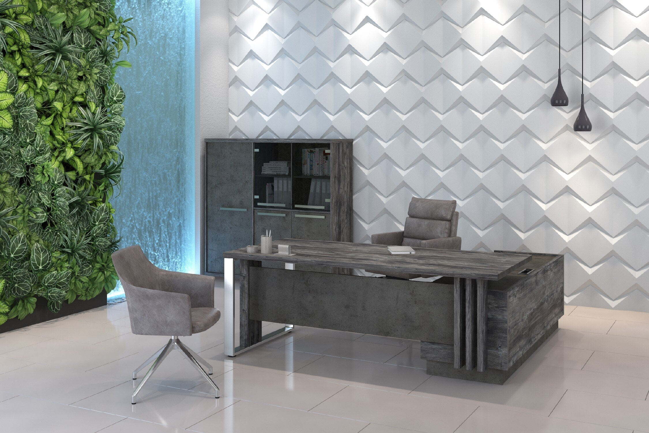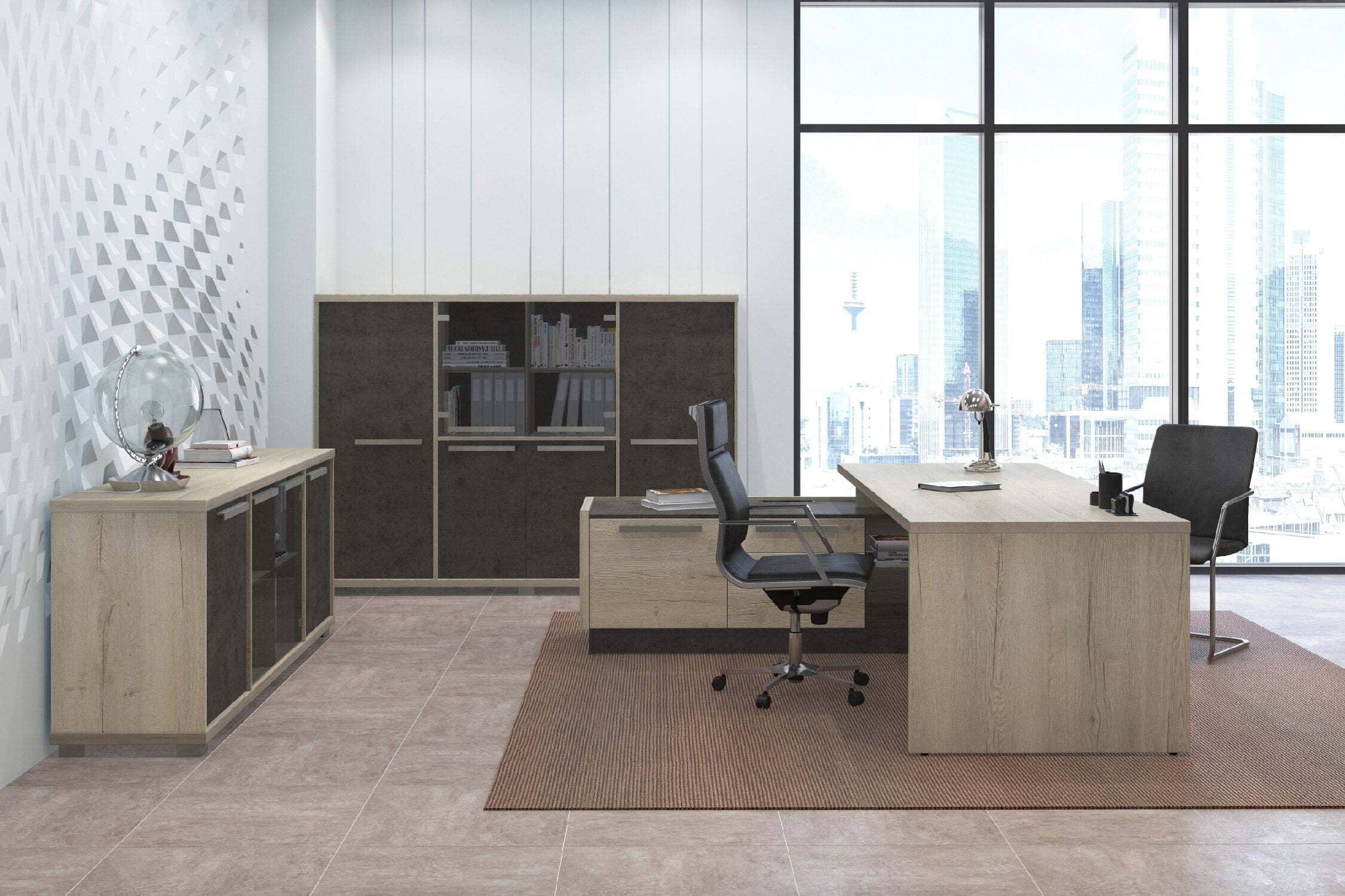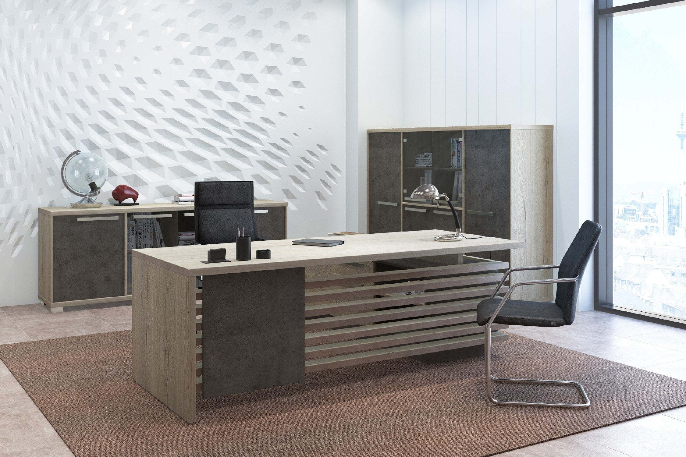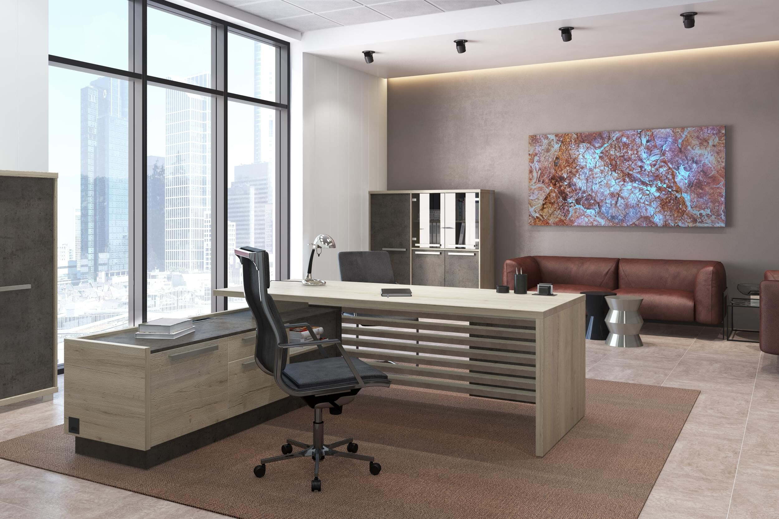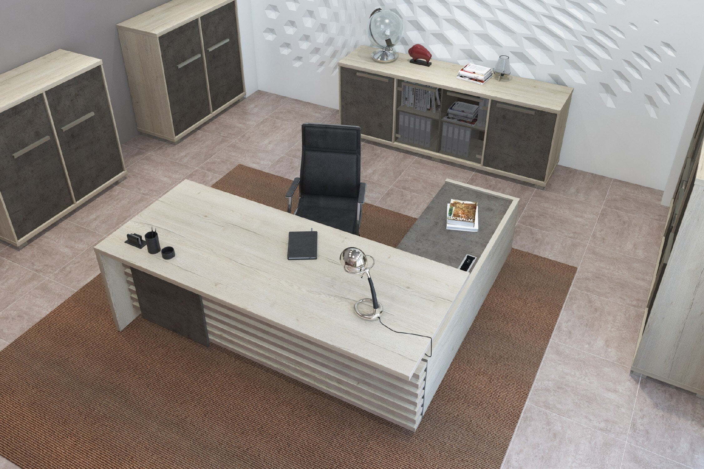 Кабинет для руководителя "Vestar" выделяется необычным дизайнерским решением - сочетание на столешницах кромки с поперечным и продольным рисунком, что даёт визуальный эффект спила натурального дерева. Кабинет "Vestar" - это эталонный выбор современного руководителя.Материал, в котором производится коллекция - ЛДСП. Толщина столешниц - 38мм. Кромка столешниц - ABS 2мм. Коллекция производится в цветах: дуб галифакс/бетон чикаго, сосна пасадена/бетон чекаго.