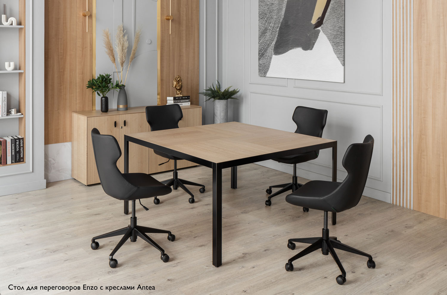 Основа концепции стола Enzo – это минималистичная металлическая рама в сочетании с столешницей из шпонированного МДФ, что обеспечивает максимальную устойчивость и надежность. Центральным элементом становится квадратный переговорный стол с уникальным разнонаправленным рисунком шпона, который превращает любую переговорную комнату в стильное и динамичное пространство. Коллекция также включает прямоугольный стол, предлагая разнообразие решений: квадратные столы размером 140 х 140 см и прямоугольные 310 х 120 см. Эти элементы мебели гарантированно подчеркнут современный стиль и элегантность вашего рабочего пространства.