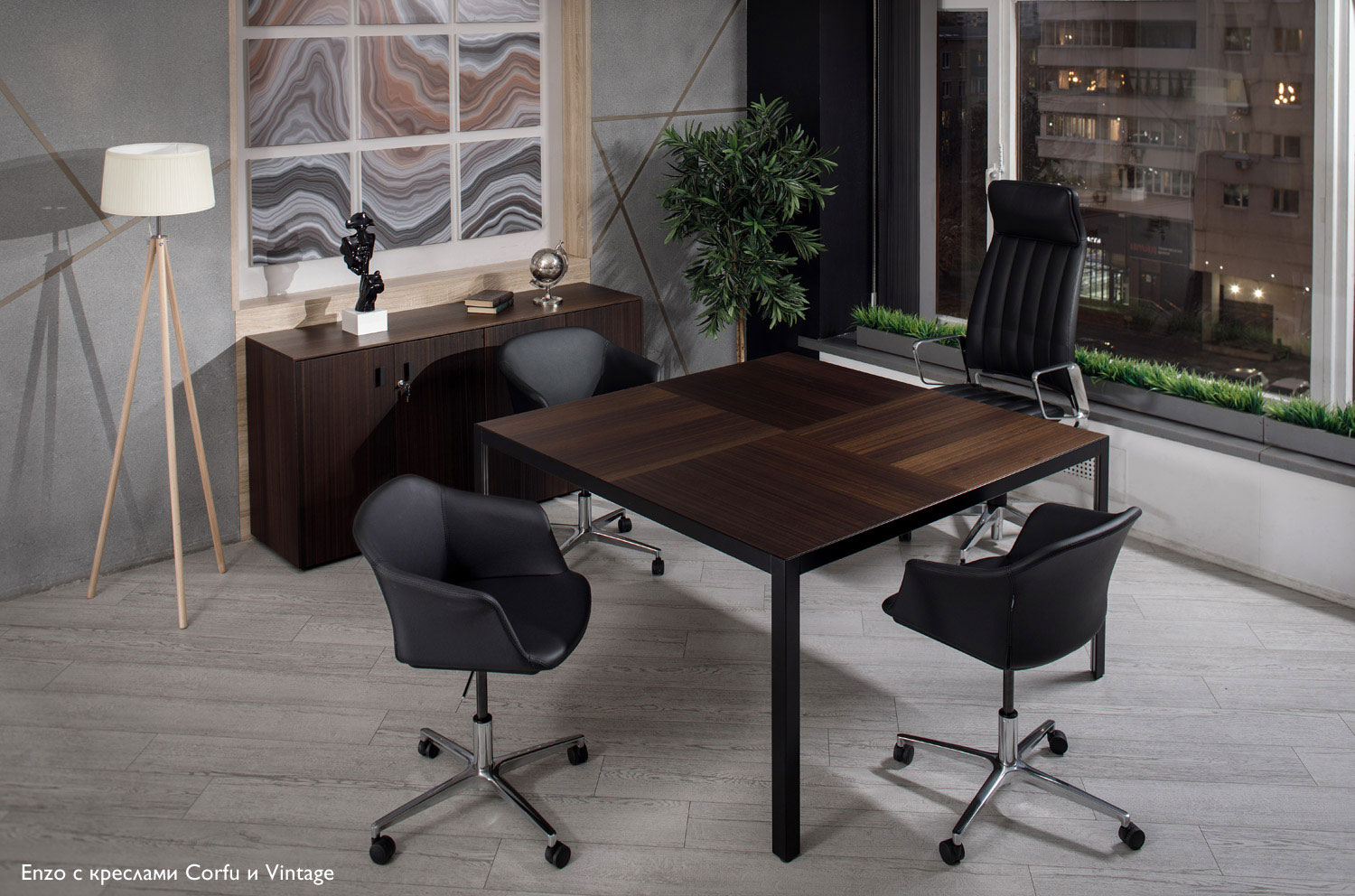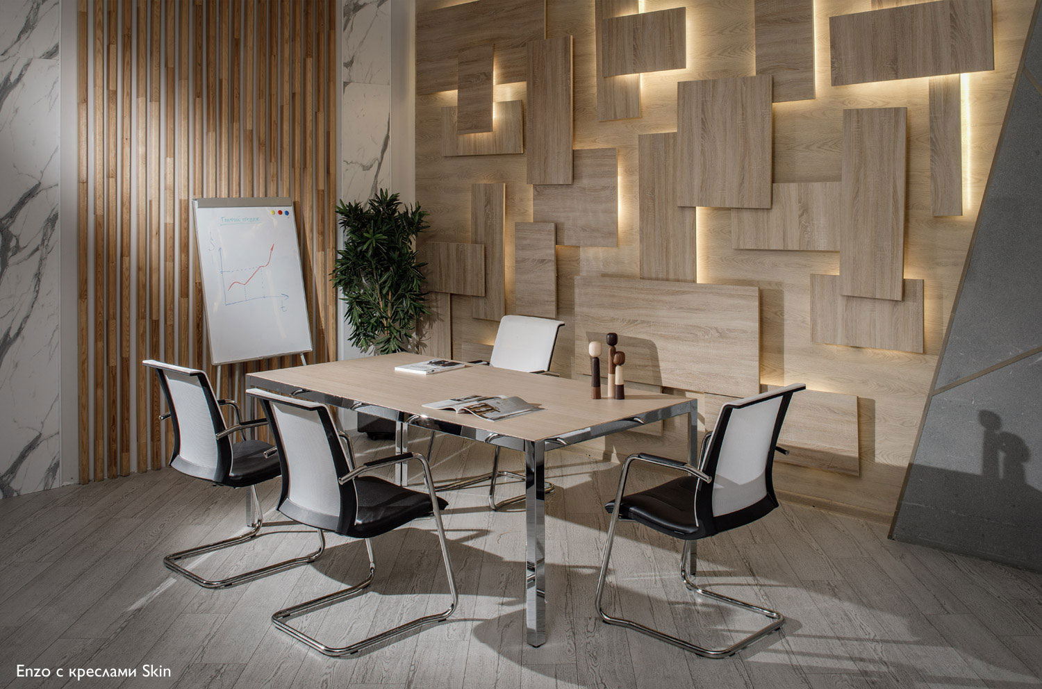 Коллекция мебели для переговоров Enzo представляет собой воплощение фундаментальной геометрии и минимализма в современном дизайне. Вдохновленные простыми и понятными формами, такими как круги, квадраты и прямоугольники, дизайнеры создали выразительные и сбалансированные предметы интерьера. Тонкие линии и четкие формы коллекции, в комбинации темного и светлого шпона эвкалипта с черным или хромированным металлом, позволяют создавать уникальные композиции с индивидуальным характером.