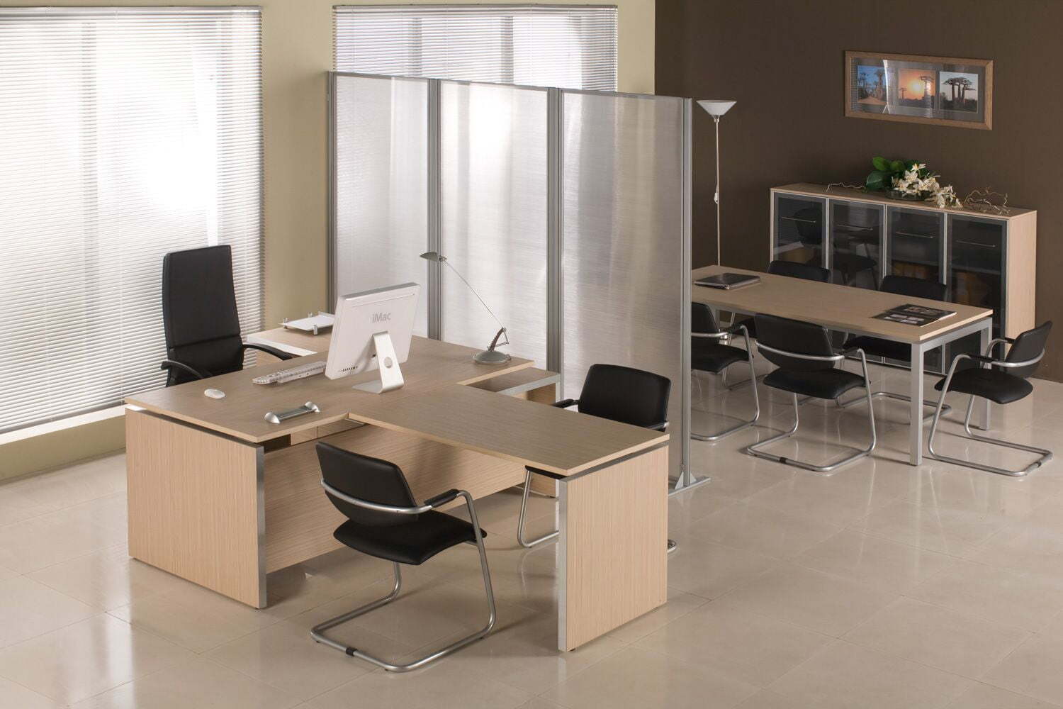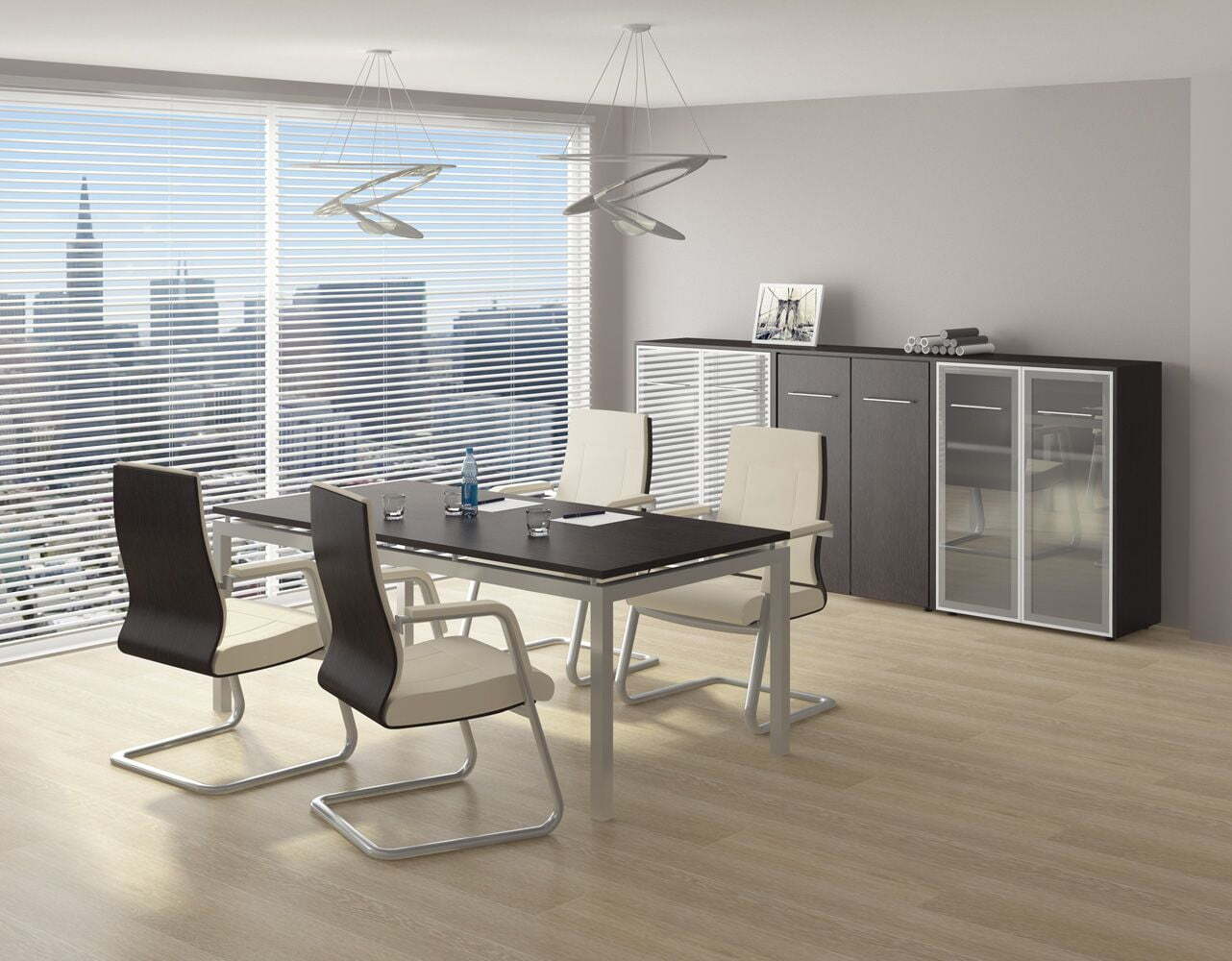 Мебель для переговоров Reventon обладает оригинальными чертами, создающими атмосферу солидности и современного стиля. Столы выделяются асимметричной L-образной опорой и металлическими рамами, что обеспечивает прочность и устойчивость конструкции. Использование ЛДСП "зебрано песочный" в отделке столов придает поверхности приятную текстуру, схожую с натуральным деревом. Опоры-колоны из нержавеющей стали дополняют общий изысканный образ и гарантируют долговечность мебели. Также предусмотрена возможностью объединения стенок из нескольких шкафов под единым топом, позволяя создавать гармоничные композиции и оптимизировать пространство. Вся коллекция производится из высококачественного ЛДСП и имеет ПВХ-кромку толщиной 2 и 0,4 мм. Доступные цветовые решения включают "зебрано песочный" и "венге темный", позволяя выбрать оптимальный вариант для любого интерьера.