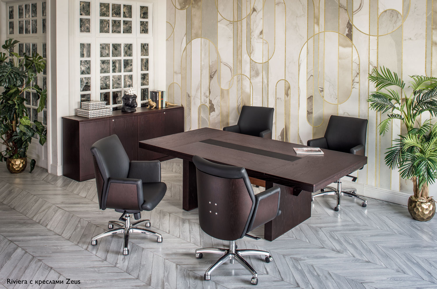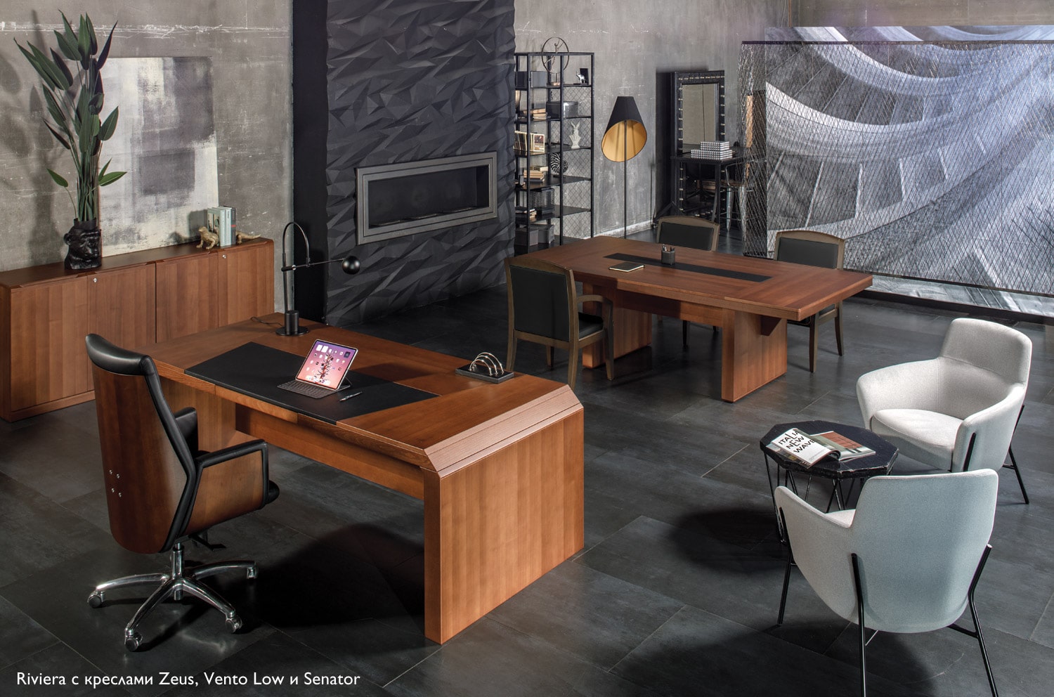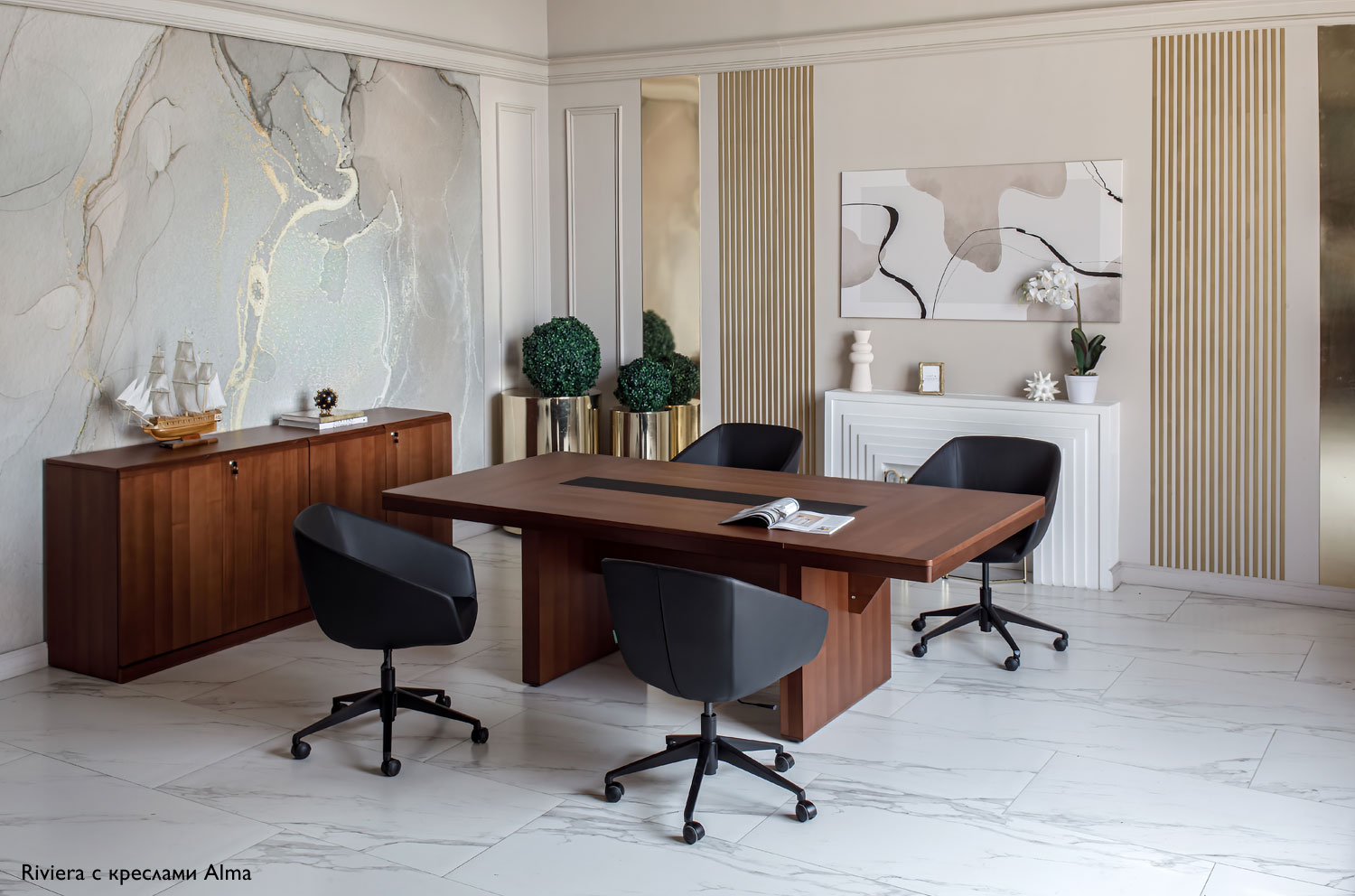 Коллекция мебели для переговоров Riviera / Mare напоминает о престиже и элегантности, присущей только высшему руководству. Кабинет Riviera / Mare идеально подойдет для ценителей изысканности и комфорта. Строгий и лаконичный дизайн линий гармонично сочетается с теплым декором, выполненным из ценных пород дерева. Особое внимание привлекает переговорный стол модели L232. С толщиной столешницы в 73 мм и массивной деревянной кромкой, тонированной в основной цвет, визуально он воплощает надежность и стабильность. В центре столешницы располагается кожаная вставка черного цвета, добавляющая утонченность и оставляющая неоспоримое впечатление. Для тех, кто предпочитает индивидуальный стиль, доступен вариант с бежевой кожаной вставкой, которая изготавливается на заказ в течение трех недель. Коллекция Riviera / Mare идеально подходит для создания атмосферы, способствующей продуктивным встречам и важным обсуждениям.